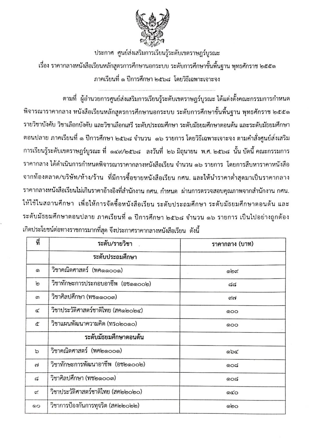 ประกาศ ราคากลางหนังสือเรียนหลักสูตรการศึกษานอกระบบ ระดับการศึกษาขั้นพื้นฐาน