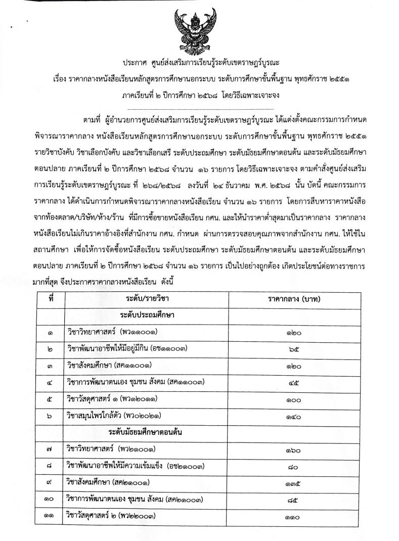 ประกาศ ราคากลางหนังสือเรียนหลักสูตรการศึกษานอกระบบ ระดับการศึกษาขั้นพื้นฐาน